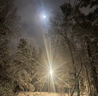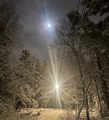 The last days of november it was snowing quite a lot, and one moonlit night I ran out in this powder with my headlamp. Soon I realized that I didn't have to put it on. The snow was so bright I could see the terrain both in the distance and closer. I had this short easy orienteering course that was perfect for a test to run withotut the lamp. When getting to the starting point that was marked with reflective tape, it was almost impossible to see it without a lamp, and the map was also difficult to read, even when the full moon was shining through the clouds.