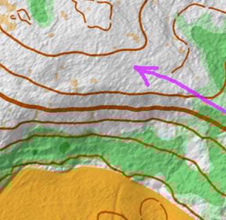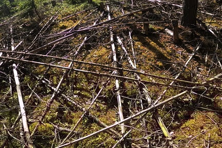 I started out on my usual path through the forest in the backyard of the cottage. It is thick green, and the worst kind of terrain. But once you get through, it opens up and there is a really small path that leads over a nice hill. It is not visible on this autogenerated map. After a couple of kilometers, the nice trails ends and you have to pass through some areas with sticks all over the ground to get to some other runnable areas. Not the ideal trail- or orienteering running area.