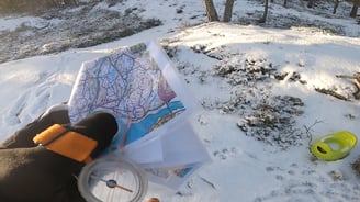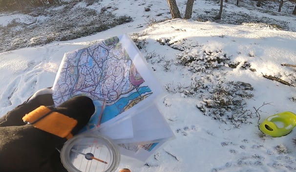 I headed out on this "course of the week" orienteering, and the -3 degrees was feeling fine. My body felt good: no knee pain anymore. Somewhere before the starting point I started to film and said to myself that I would do a "snow orienteering crash course", whatever that was. It was a bad way to start off, because the first control was a lot of undistinct trail orienteering. The trails was hidden behind snow and I lost them all the time. Soon into the first control I started filmning and 20 seconds later on I was so unfocused I really messed the mapreading up and was running to the wrong hill.